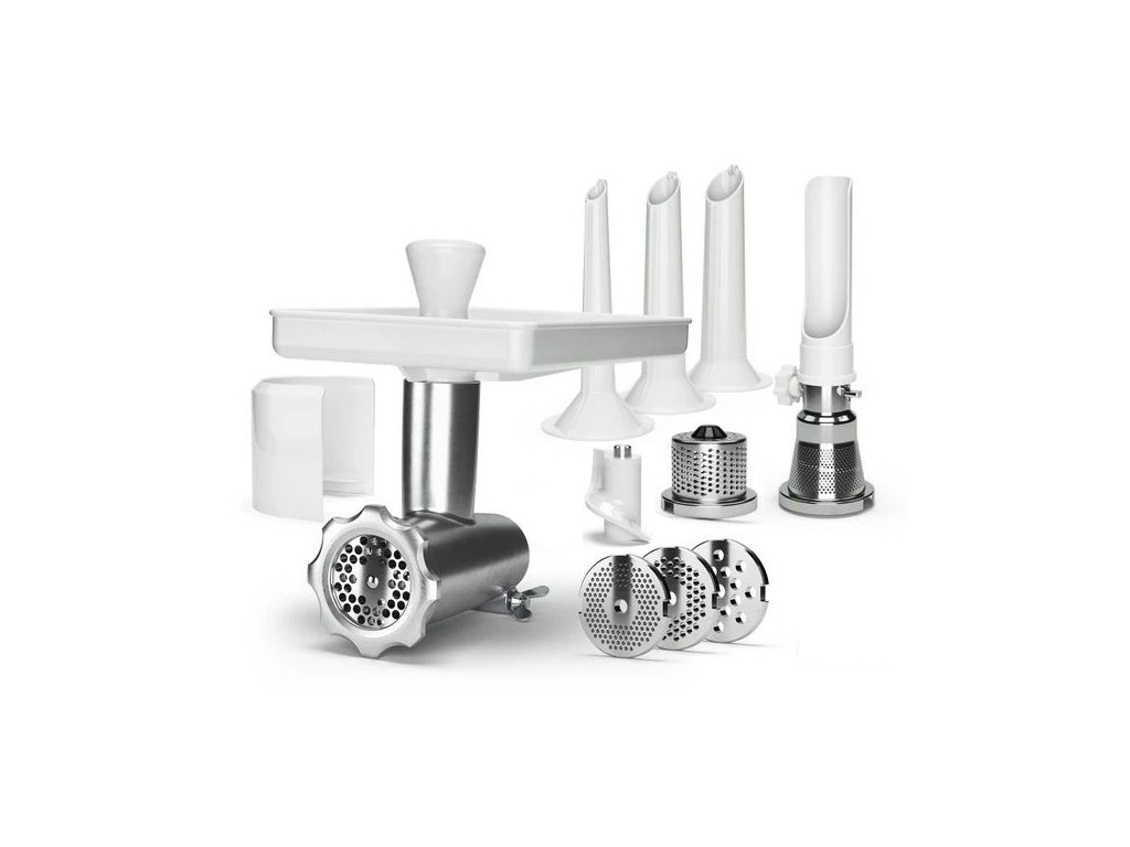 - Mlýnek na maso s disky a plniči klobás - Zpracovávejte vlastní mleté maso, tvarujte vlastní klobásy nebo připravujte vegetariánské varianty, jako jsou falafel nebo cizrnové placičky. Snadno nastavíte strukturu od jemného po hrubé mletí.