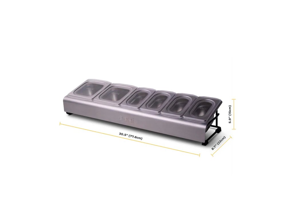 Tento praktický organizér vám umožní mít všechny suroviny přehledně uspořádané a vždy po ruce – ideální pro rychlou a efektivní přípravu více pizz po sobě. Odolná konstrukce kombinuje práškově lakovanou uhlíkovou ocel, nerezovou ocel a kvalitní plastové a silikonové prvky, které zajišťují dlouhou životnost i snadnou údržbu.